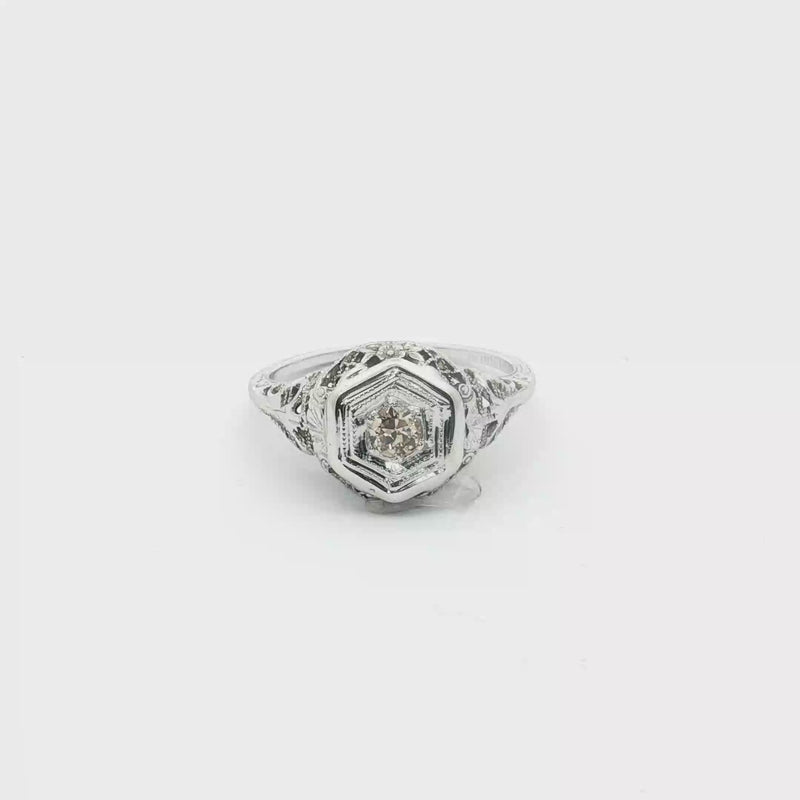 18K wt Estate Vintage Filigree Ring With 1= 0.16TW Round Diamond 2.36 grams Size 6.5