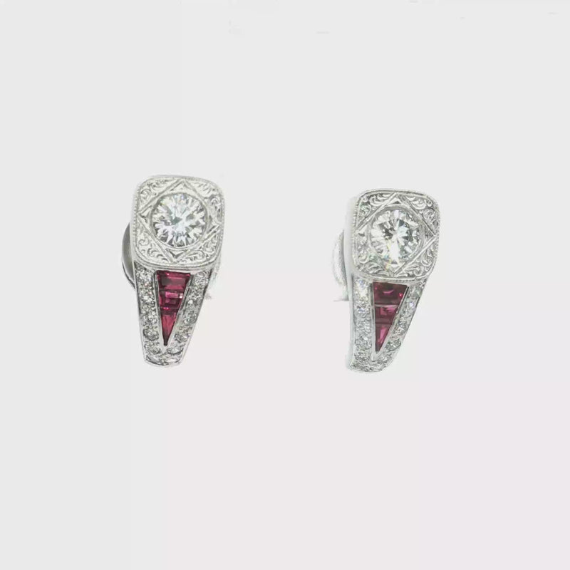 Platinum Estate Earrings With 6=0.36TW Baguette Rubies And 26=0.80TW RBC Diamonds.